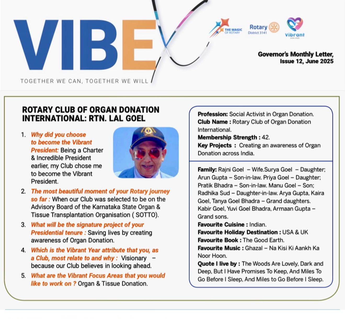 “I am deeply honoured and grateful to you for including my profile in the VIBEX GML for June 2025. This recognition means a great deal to me personally and to our club’s mission of promoting Organ Donation awareness,” stated Rtn Lal Goel.
